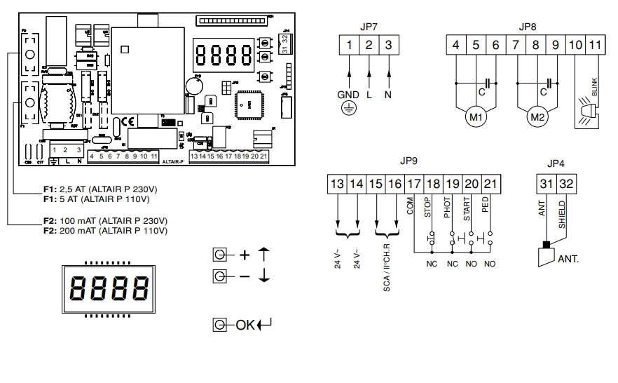 – Entradas auxiliares: Botón STOP, fotocélula, START, OPEN, POSTIGO