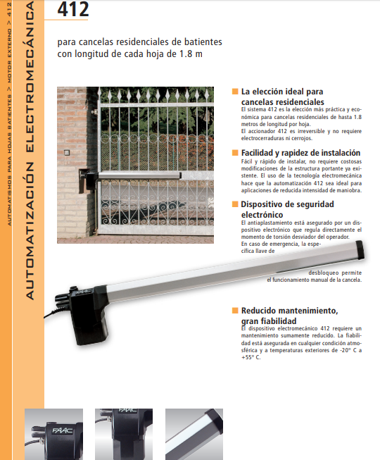 El FAAC 412 destaca por su diseño simple y robusto. Su sistema electromecánico es de fácil instalación y requiere un mínimo mantenimiento, lo que garantiza años de funcionamiento sin complicaciones. El motor es irreversible, lo que significa que el portón queda bloqueado mecánicamente una vez cerrado, añadiendo una capa extra de seguridad a tu propiedad sin necesidad de instalar una cerradura eléctrica adicional.